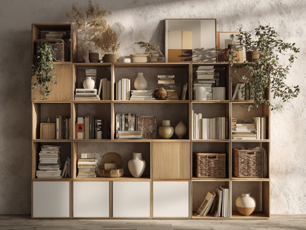 En un rincón boho, la librería no es solo un mueble, es el paisaje que define el carácter del espacio. Lo modular te da la ventaja de construir con intención: puedes decidir si quieres una pared completa tipo biblioteca, una columna vertical que actúe como totem o una combinación asimétrica que parezca orgánica, casi improvisada. Lo importante es que el conjunto no se vea rígido; el boho pide ritmo, capas y pequeñas irregularidades bien pensadas. Una buena estrategia es combinar módulos cerrados y abiertos, porque el boho no es “mostrarlo todo”: es alternar lo visible con lo escondido para que haya calma. Los módulos cerrados te ayudan a guardar lo que ensucia visualmente —papeles, cargadores, bolsas, objetos sin narrativa— y los abiertos quedan para libros, piezas artesanales, cestas y recuerdos. Cuando consigues ese equilibrio, el rincón se siente cálido, pero también ordenado, que es lo que diferencia un boho elegante de un boho caótico.
