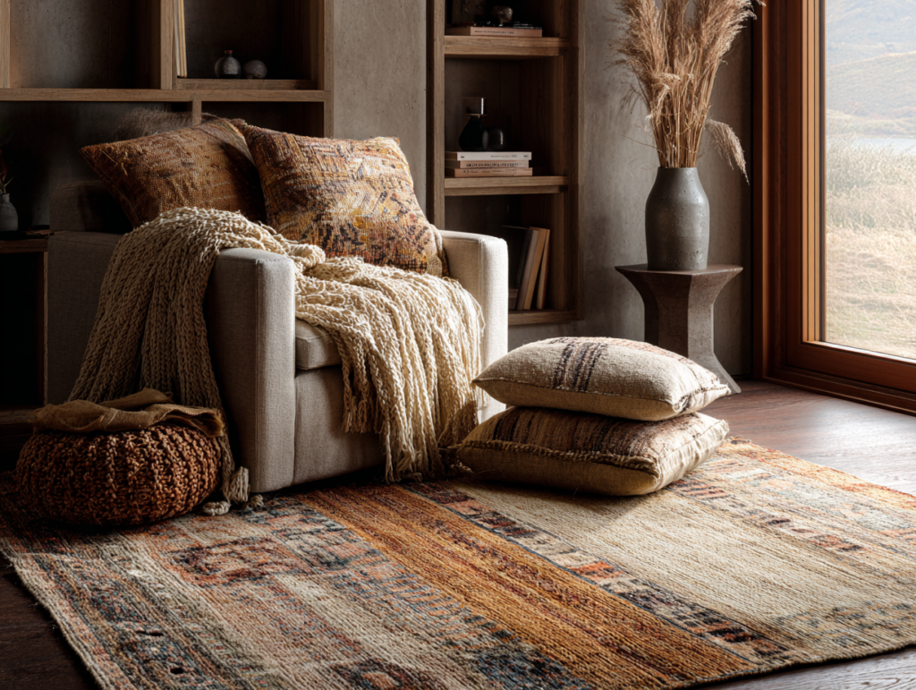 Si tu rincón de lectura boho no tiene capas, no termina de ser boho. Las capas son las que convierten una esquina funcional en un lugar que inspira. Una alfombra define territorio; no solo decora, delimita el “aquí me quedo”. Encima, un cojín lumbar y otro más blando cambian la postura y la energía del asiento. Una manta, mejor si es de textura marcada, añade esa sensación de refugio inmediato. Lo interesante es que el boho contemporáneo no necesita exceso de estampado; puede ser neutro y aun así sentirse bohemio si trabajas bien los materiales: lino lavado, algodón, lana, yute, bouclé. La clave está en mezclar, pero con un hilo conductor cromático. Cuando el color se mantiene en una gama —arena, terracota, verde oliva, tostados, blanco roto— puedes permitirte más textura sin que el conjunto se vea recargado. Es ahí donde la librería modular se convierte en un marco perfecto: ordena visualmente las capas, les da “arquitectura”.
