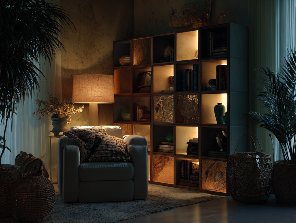 Un rincón de lectura no se sostiene con una luz de techo general, y menos si quieres una atmósfera boho. Necesitas una luz que acompañe, que cree intimidad y que sea amable con la vista. Lo ideal es una lámpara de pie o de mesa con una temperatura cálida, porque el boho vive en la calidez. Si tienes librería modular, piensa en cómo la luz también puede ponerla en valor: una tira LED discreta en un estante, una lámpara pequeña que proyecte sombras suaves, un aplique orientable si no quieres ocupar superficie. La iluminación no solo sirve para leer; sirve para contar una historia. Una luz bien colocada convierte una estantería en un escenario y hace que los libros y objetos parezcan más intencionados. Además, ayuda a que el rincón funcione de noche, que es cuando más apetece.
