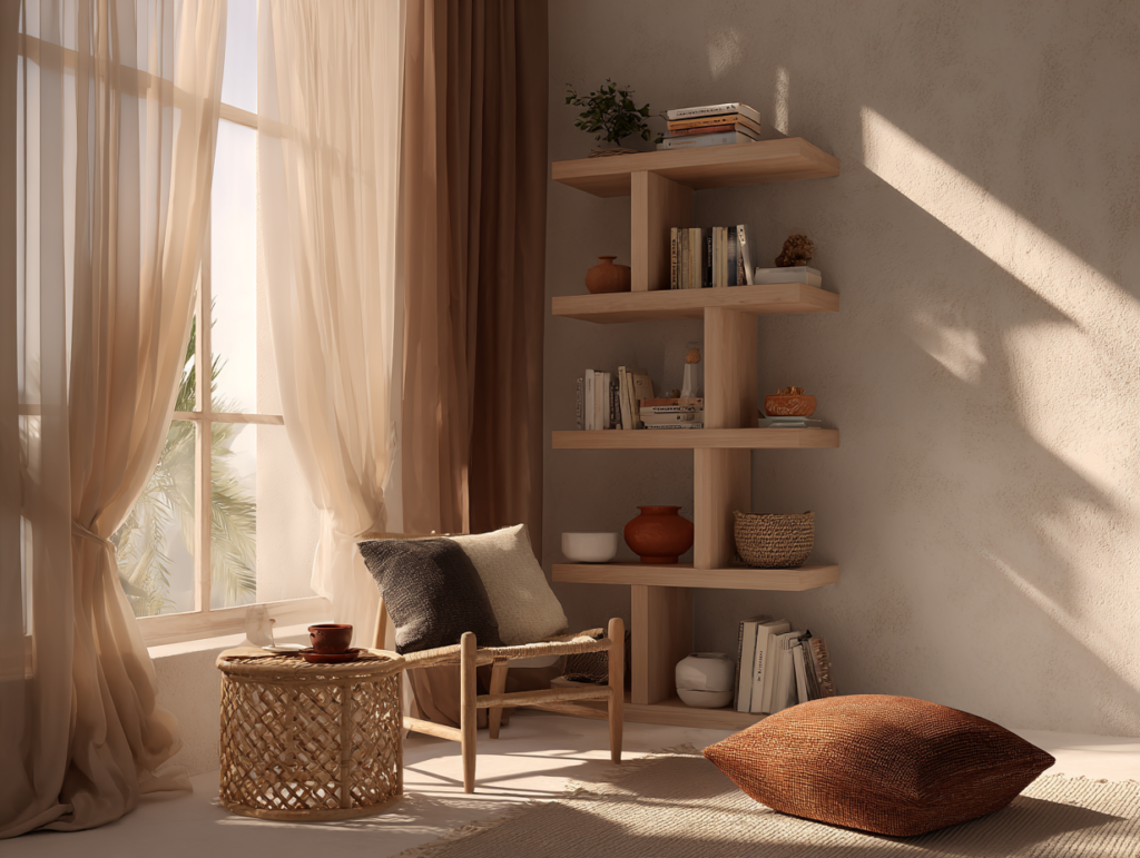 La butaca o el asiento es el corazón del rincón, y por eso conviene elegirlo desde la experiencia, no desde la foto. El boho admite muchas lecturas: una butaca de líneas suaves en lino, un sillón de ratán con cojín generoso, una chaise pequeña, incluso un banco tapizado con respaldo si el espacio es estrecho. Lo que importa es que, al sentarte, el cuerpo diga “sí” sin negociación. Si el asiento es cómodo, el rincón se utiliza; si solo es bonito, termina siendo decoración. El boho se construye con vida real: mantas que se usan, cojines que se abrazan, libros con páginas dobladas. Por eso la textura es crucial: tejidos naturales, tacto amable, materiales que envejecen bien. Una pieza demasiado dura o demasiado formal rompe la atmósfera. Y aquí un detalle que eleva el conjunto: que el asiento dialogue con la librería modular, ya sea por contraste (madera clara con textiles cálidos) o por continuidad (tonos arena, fibras, blanco roto), para que el rincón parezca diseñado como un todo y no como una suma de objetos.