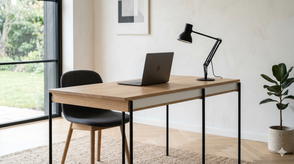 El escritorio es la pieza central de cualquier zona de trabajo, así que su diseño influye directamente en la sensación de orden. Para lograr una estética minimalista, conviene apostar por líneas rectas, materiales nobles o acabados lisos, y una estructura visualmente ligera.