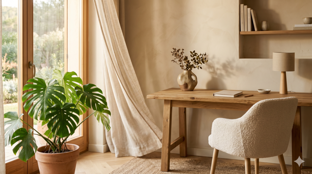 Para evitar que el resultado sea plano, se puede jugar con texturas: una pared lisa, una mesa de madera natural, una alfombra de tejido orgánico o una cortina de lino aportan riqueza visual sin romper la serenidad del entorno.