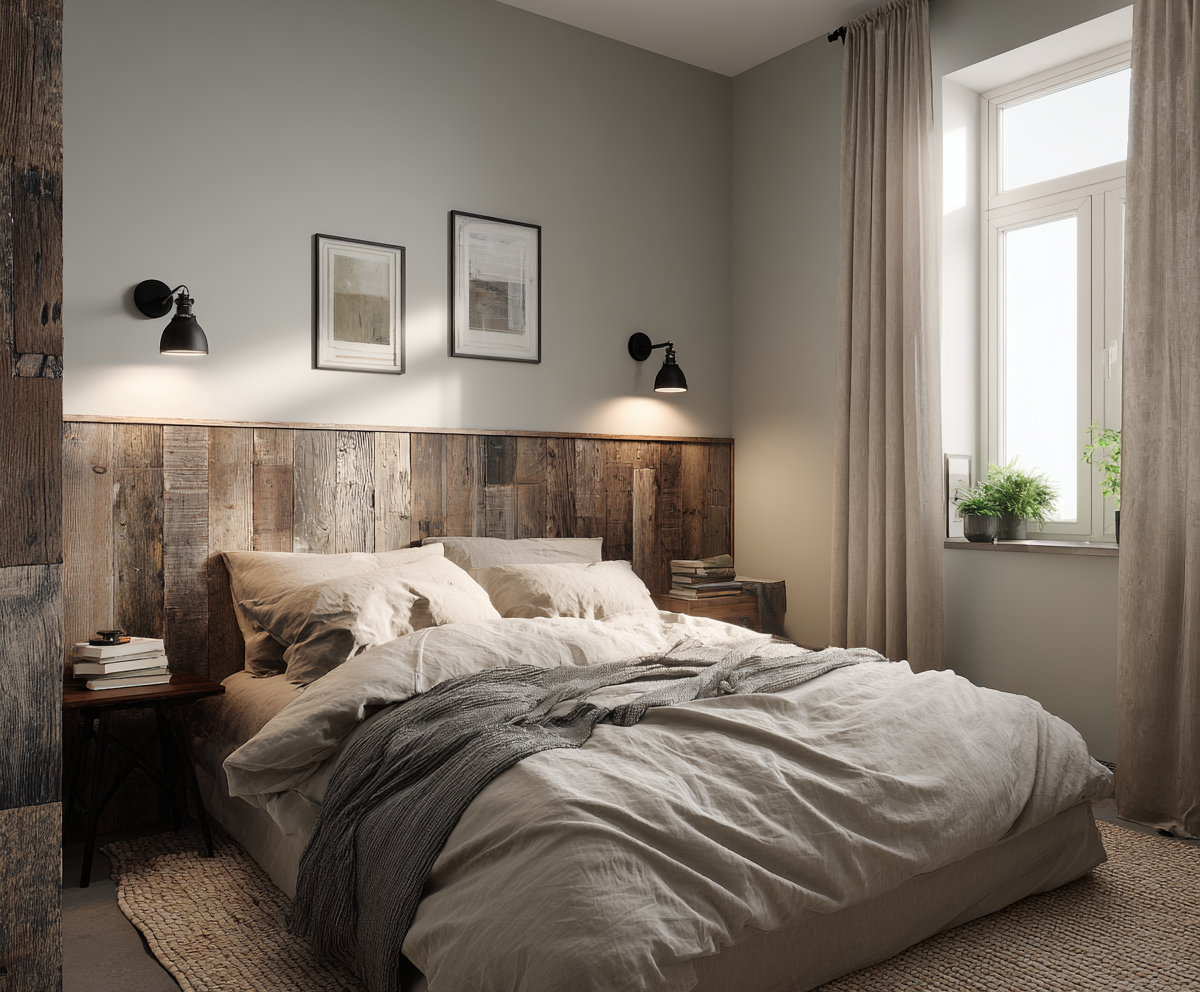 El cabecero es el gran protagonista del dormitorio y el lugar idóneo para introducir la madera envejecida en toda su riqueza táctil. Tablas cepilladas, acabados aserrados o chapas nobles con pátina realzan la textura y aportan profundidad. El metal negro, ya sea en forma de bastidores finos, lamas o placas microperforadas, añade el contrapunto gráfico. La solución mixta —marco metálico y paño central de madera— resulta especialmente equilibrada y duradera.